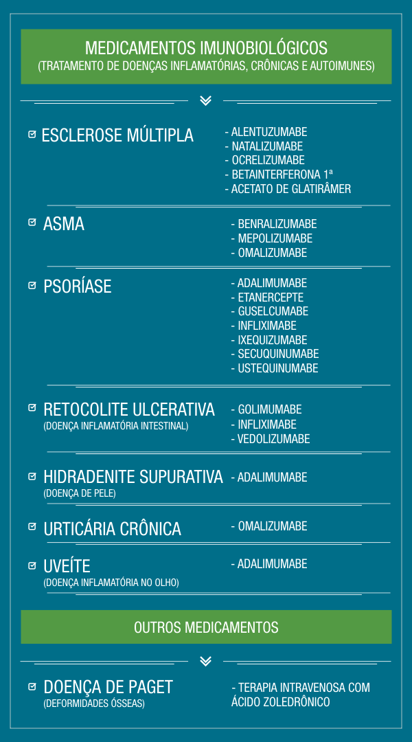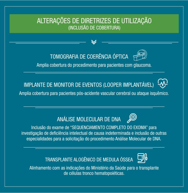 A partir dessa atualização, 69 coberturas estão sendo acrescentadas ao Rol dos planos de saúde, sendo 50 relativas a medicamentos e 19 referentes a procedimentos como exames, terapias e cirurgias. Na lista de medicamentos, estão 19 antineoplásicos orais que contemplam 28 indicações de tratamento para diversos tipos de câncer; 17 imunobiológicos com 21 indicações para tratamento de doenças inflamatórias, crônicas e autoimunes, como psoríase, asma e esclerose múltipla; e 1 medicamento para tratamento de doença que leva a deformidades ósseas. Na lista dos procedimentos estão exames, terapias e cirurgias para diagnóstico e tratamento de enfermidades do coração, intestino, coluna, pulmão, mama, entre outras.